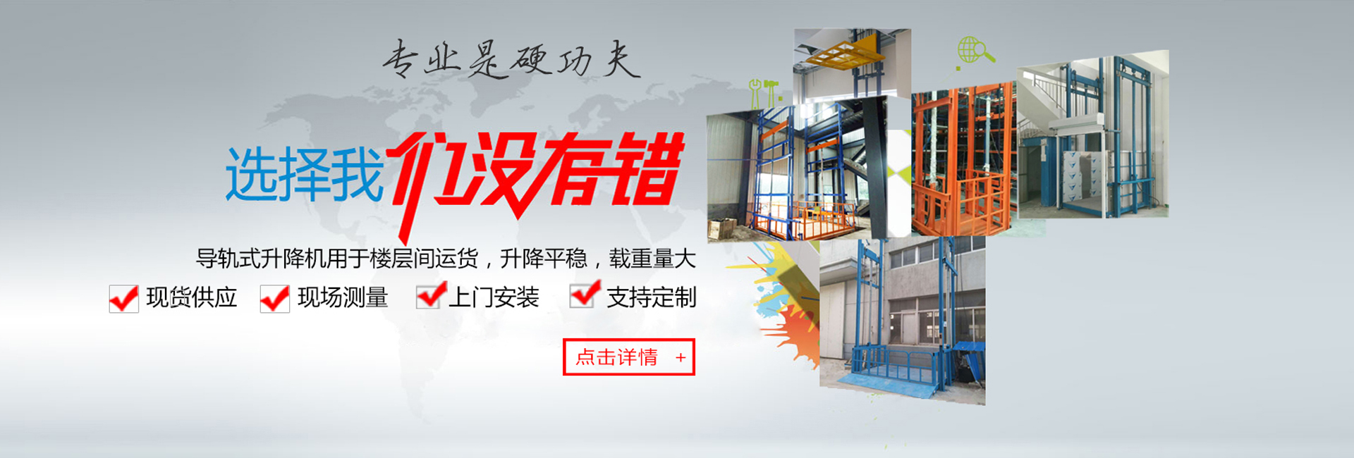 濟(jì)南強(qiáng)森升降機(jī)械有限公司是專業(yè)的液壓貨梯專業(yè)生產(chǎn)廠家, 主導(dǎo)產(chǎn)品為:SJY系列貨梯、固定式液壓升降貨梯、導(dǎo)軌式貨梯、導(dǎo)軌式升降機(jī)、登車橋、移動(dòng)式升降機(jī)、大噸位貨梯等各種特殊產(chǎn)品,廣泛用于建筑內(nèi)外裝修、車間、車站、商店、大廳、路燈、物流裝卸、工業(yè)流水線、高速公路等各行各業(yè)。售后服務(wù)鄭重承諾:·公司承諾設(shè)備免費(fèi)保修期一年,終身維護(hù)。設(shè)備保修期過后,只收取零部件及維修成本費(fèi)·設(shè)備到現(xiàn)場后,由經(jīng)驗(yàn)豐富的專業(yè)技術(shù)人員對設(shè)備進(jìn)行免費(fèi)調(diào)試并負(fù)責(zé)培訓(xùn)設(shè)...